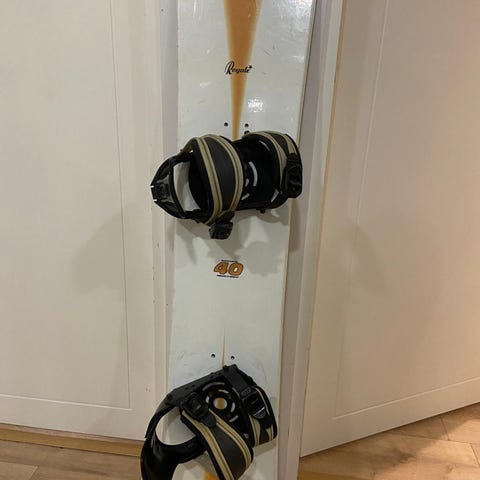 Elan lumilauta jossa Crazy Creekin jalkapidikkeet. Oikeanpuolen jalkapidikkeen toinen side lähes irronnut mutta niitä saa ostettua uusia ja vaihdettua helposti. Käytönjälkiä löytyy mutta vielä ihan kelpo lauta.