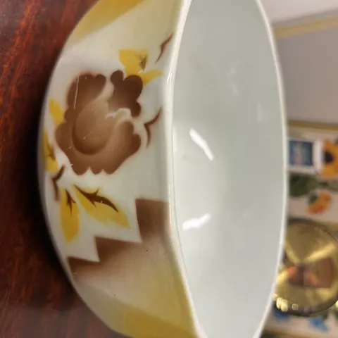 Kaksi Arabian vanhaa kulmikasta kulhoa, joissa on keltainen ja ruskea puhalluskuviointi. Kuviointi on tyypillinen aikakaudelle.