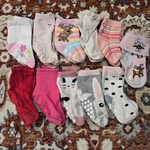 5 kpl samaa sarjaa olevia sukkia, joissa pohjassa stopparit, mitkä estävät sukkia luistamasta lattialla. Olleet yhdellä lapsella käytössä, mutta kaikki sukat ovat ehjiä.