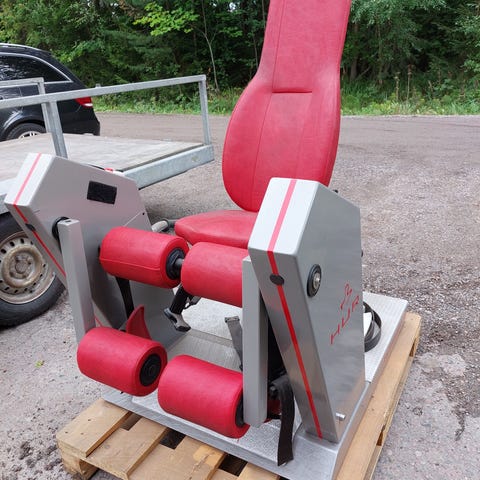 Italialainen Executive Line reiden ojennus istuen. Voit treenata jalkoja erikseen tai yhtäaikaa. Vaijerit kiristetty äärimmilleen jote vastus alkaa heti ala ääriasennosta. Nahat uusittu. Painopakka 80kg. Laitteen voi siirtää kokonaisena nokkakärryllä, sijaitsee katutasossa. Noin 70 cm leveä ja alle 2m pitkä.