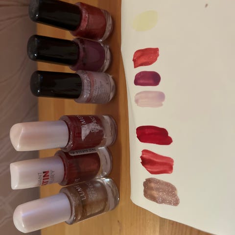 Käyttämättömät kynsilakat Dermosililtä. Vihreä, punainen ja valkoinen kynsilakka sekä tähtimuotti.