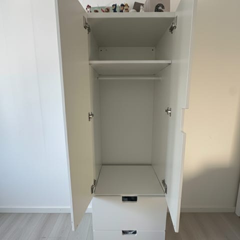 Småstad vaatekaappi, jossa vaatetanko sekä ulosvedettävä ritiläkori. Alaosassa 4 ulosvedettävää laatikkoa.
