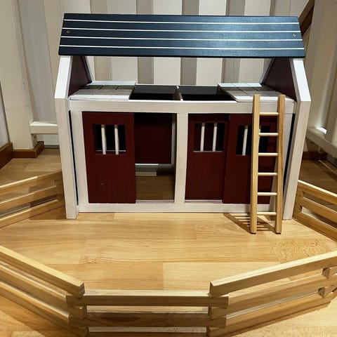 Tyylikäs puinen Tiger merkkinen hevostalli (pikkuhevoset eivät kuulu kauppaan, ovat rekvisiittaa). Hevostalli (13,5cmx8x14,5cm). Tallin ovet (4,8cmx5,8cm). Nouto Lohikoskelta (mahdollisuus R-kioski lähetykseen, paketti+ lähetys: 5e + hevostallin hinta).