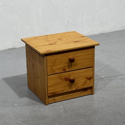 Yöpöytä, jossa on kaksi leveää laatikkoa. Runko on valkoinen ja etulevyt vaaleaa puuta. Sopii käytettäväksi makuuhuoneessa yöpöytänä tai pienenä säilytyskalusteena muissa tiloissa.