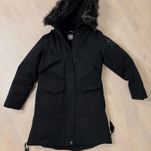 Halti naisten untuvaparka, koko 34. Vihreä, polvipituinen malli, jossa edessä vetoketju ja painonapit. Takissa on kiinteä huppu, jossa tekoturkisreunus, sekä useita taskuja edessä. Hihansuissa resorit sisäpuolella.