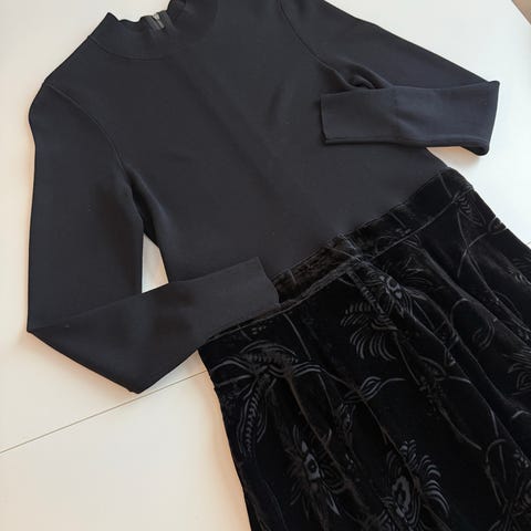 Yksityiskohdat: V-pääntie, lyhyet cap-hihat, takana halkio ja kullanvärinen vetoketju