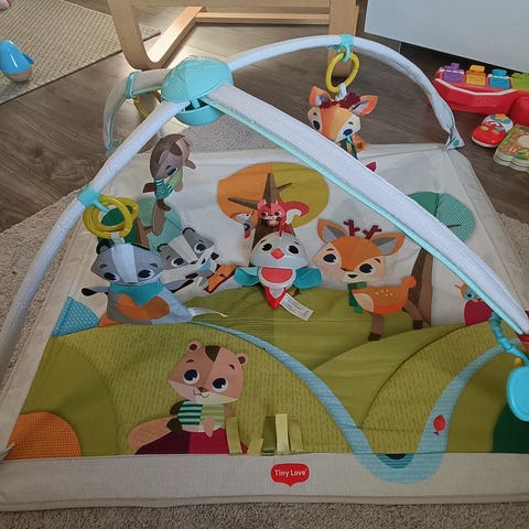 Tiny Love leikkimatto kaarilla ja roikkuvilla leluilla. Pehmeä leikkialusta, jossa värikäs metsäteemainen kuvitus. Ristikkäiset kaaret, joihin on kiinnitetty erilaisia pehmoleluja ja helistimiä vauvan katseltavaksi ja kosketeltavaksi. Mukana irrotettava peili ja muita pieniä leluja, jotka voi kiinnittää eri kohtiin mattoa. Soveltuu vauvan lattialeikkeihin ja harjoittelemaan vatsallaan oloa sekä tarttumista ja kurottelua.