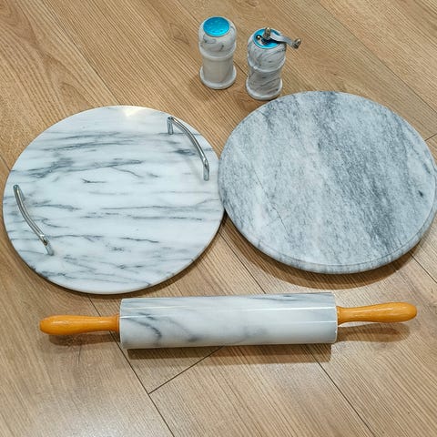 Marmorinen tarjotin, mortteli ja juustoveitset