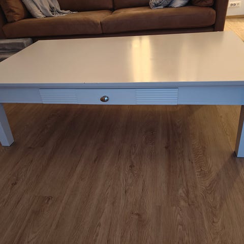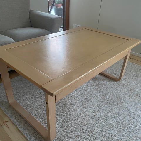 Massiivipuinen sohvapöytä, jossa suorakaiteen muotoinen kansi ja pyöristetyt kulmat. Pöydässä on alhaalla jalat yhdistävä poikkipuu, jossa voi lepuuttaa jalkoja.