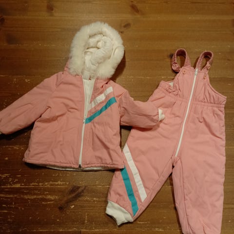 Setti on vain kerran sovitettu ja todettu meidän lapselle liian pieneksi, joten vaatteet ovat täysin puhtaat ja käyttämättömät. Setti maksoi uutena 60e ja on laadultaan erittäin vakuuttava: kangas on jämäkkää ja toppaus on todella paksu – tällä pärjää hienosti kovillakin pakkasilla.