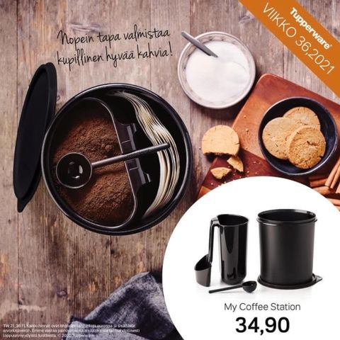 ❤️ Tupperware my coffee station, 3,7l astia, sisällä lokerot suodatinpusseille ja paketillinen kahvia mahtuu, kahvimitta