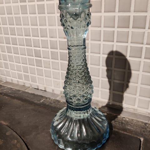 Kaunis sininen kynttilänjalka. Hyväkuntoinen ja ehjä. Steariinia hieman, mutta saattaisi lähteä huolellisella putsauksella.