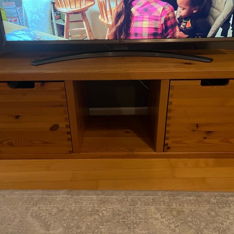 Ihana tv-taso, joka sopii yhtä hyvin neutraaliin kuin värikkääseen sisustukseen. Käytön jälkiä on hieman, mutta ne eivät ole merkittäviä. Hyllytason voi irrottaa.