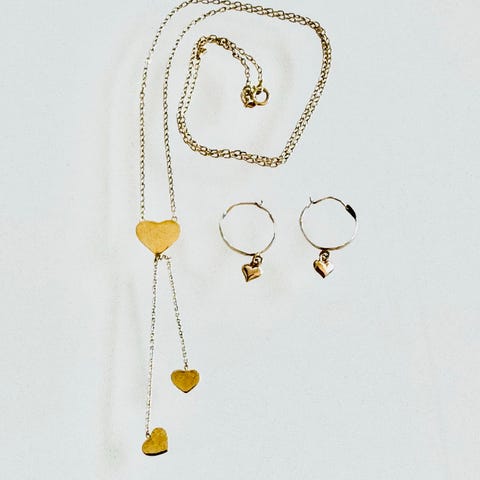 Myydään 14 Karaatin kultainen sydänriipus - tuplasydän, jossa isomman sydämen sisällä pieni sydän, sekä ympärillä kauniita kirkkaita korukiviä