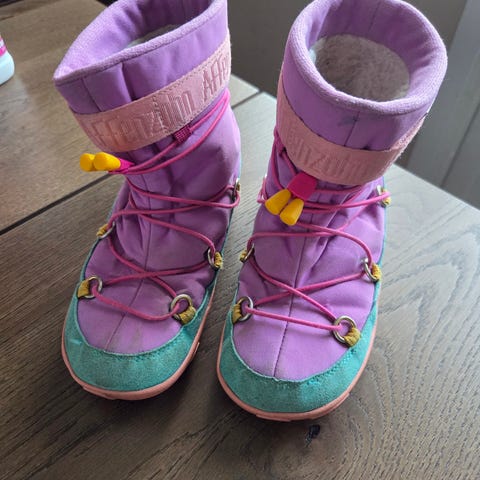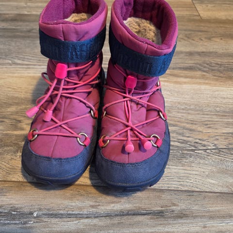 Affenzahn Snowboot lasten talvikengät unisex-mallia, koko 32. Nämä on meille uutena ostettu, yhden lapsen käyttämät. Kengät ovat muuten hyvässä kunnossa, mutta nauhat kannattaa vaihtaa, niissä kulumaa.