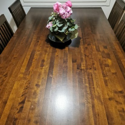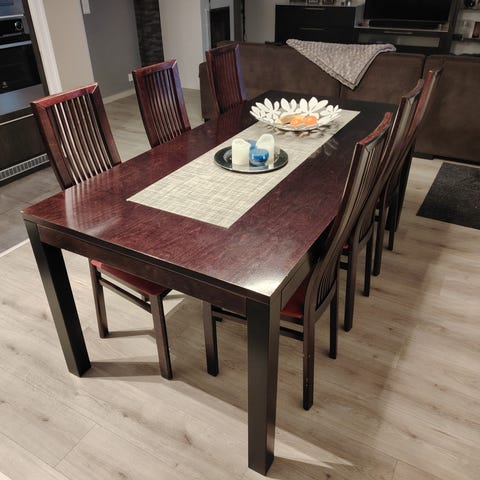 Erittäin siisti ja hyväkuntoinen kuuden hengen ruokailuryhmä. Mukaan kuusi tuolia ja valkoiset ja punaiset istuintyynyt. Hankittu Askosta.