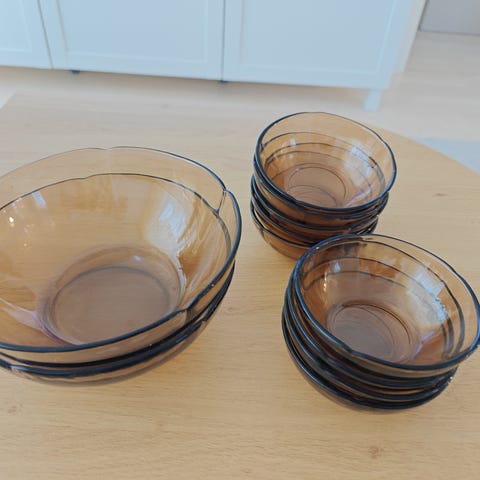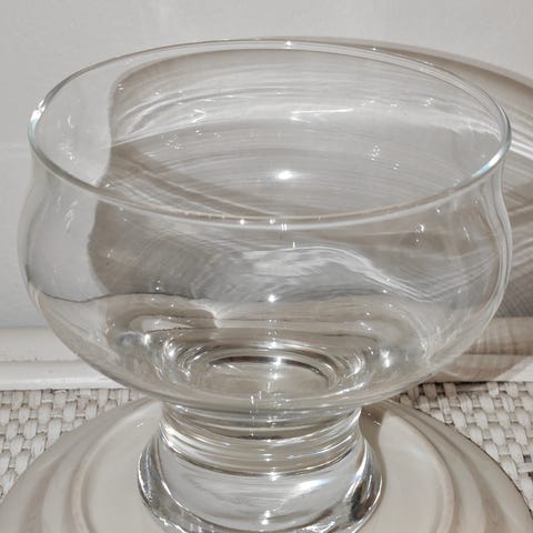 Lasiset jälkiruokakulhot 6 kpl. Ranskalaiset puristelasiset kulhot. Puristelasi on kestävämpää, kuin tavallinen lasi, joten kestävät kovaakin käsittelyä. Ainakin 30v. vanhat. Kulhon pohjassa merkintä Made in France.