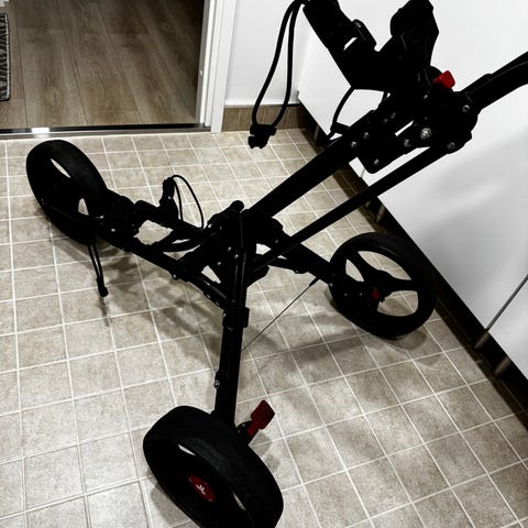Vähänkäytetty, siistikuntoinen golfkärry, paljon hyödyllisiä ominaisuuksia
