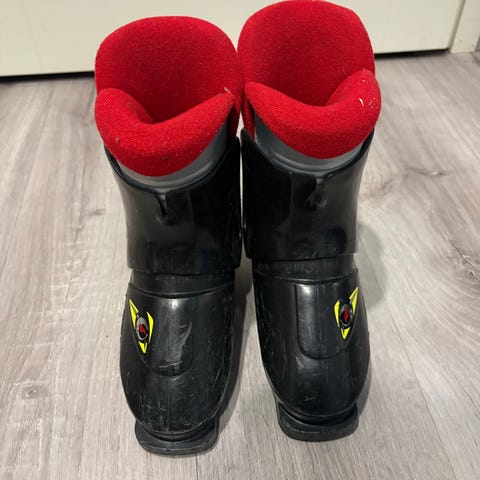 Vähän päheemmät laskettelumonot. 40 jalkaan sopivat. Kengänpohjissa merkinnät 27. Väri pääosin valkoinen mustilla ja tummanpunaisilla yksityiskohdilla. Monot kiristetään kahdella soljella ja leveällä tarranauhalla.