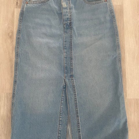 Supertrendikäs raidallinen denim-hame merkiltä M.i.h Jeans. Suora, kapea malli, edessä nappikiinnitys ja taskut, takana halkio. Ajaton sinivalkoinen raitakuosi. Kunto hyvä.