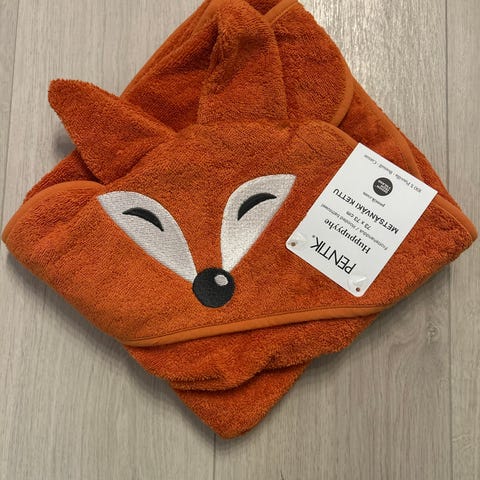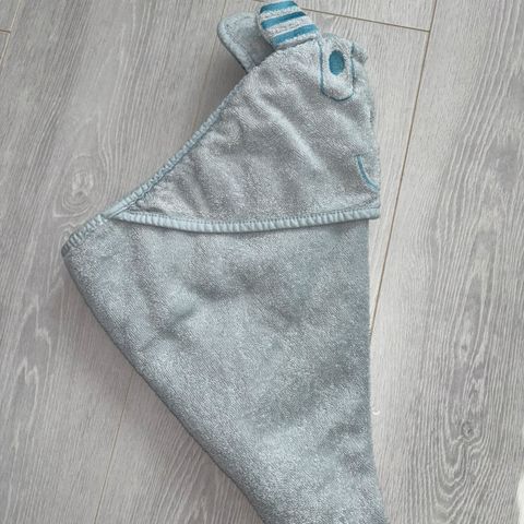 Pari kertaa käytetty huppupyyhe ja käyttämätön helistin.