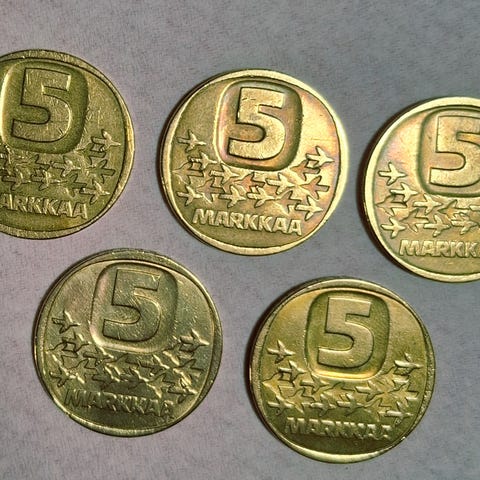 Kuvanmukaiset 5 markan kolikot vuodelta 1973, 5kpl.