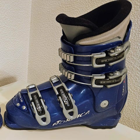 Nordica lasten monot koossa 22,5. Väriltään harmaat punaisella sisävuorella ja punaisella kiristysremmillä. Sopivat lasketteluun lapsille, joille 22,5-kokoinen mono.
