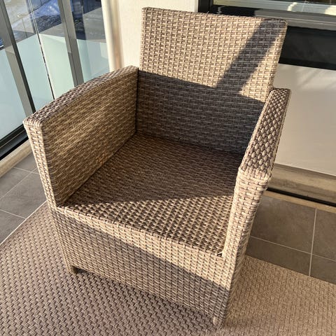 Vähän käytetty roosa/ruskean sävyinen pehmuste & metallirunkoinen lepotuoli parvekkeelle.