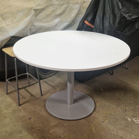 Valkoinen pöytä, ruskeilla puujaloilla.