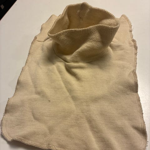 Hyväkuntoinen Ruskovillan pehmeä kypärähuppu 100 % luomu merinovillaa.
