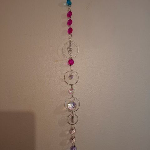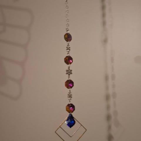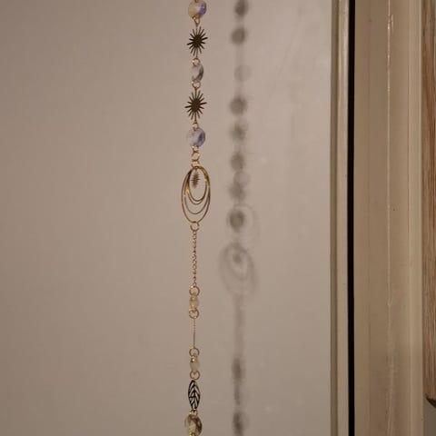Aurinkosieppari ikkunaan roikkumaan aurinkoiselle puolelle, aurinko heijastaa pieniä valopilkkuja seiniin ja kattoon kristalleista