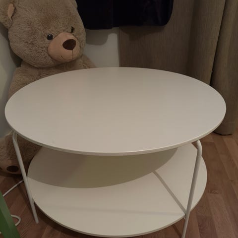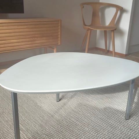 Selkeälinjainen pieni sohvapöytä. Alumiinijalat puukannella. Mitat: L80 x S50 x K40. Hieman elämänjälkiä.