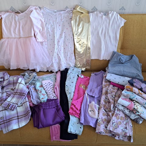 Hyväkuntoinen tyttöjen käyttövaatepaketti 98/104 koossa. Osaa käytetty enemmän ja osaa vähemmän.