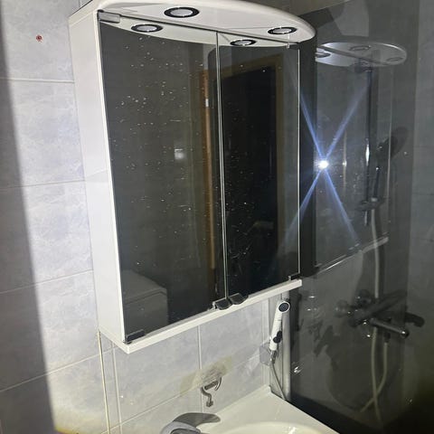 Valkoinen peilikaappi 60x77 cm. Sisäsyvyys 15 cm, joten hyvin mahtuu sisälle tavaraa. Oikeanpuoleisessa peilioven peilissä on virhe, joka näkyy tietystä kulmasta katsottuna, mutta ei häiritse muuten käyttöä (kolmas kuva). Peilikaapin sisällä käytön jälkiä, jotka näkyvät kuvissa. Valon kupu on kellertynyt ajan mittaan, en ole koittanut putsata.