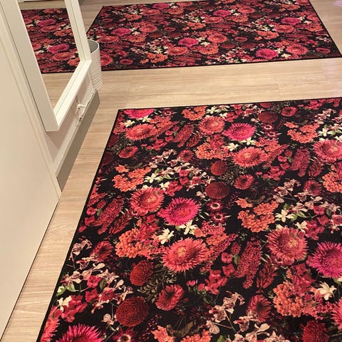 Suuri siisti ja ehjä bukleematto, joka pysyy hyvin paikallaan, eikä kerää kaikkea pölyä itseensä.