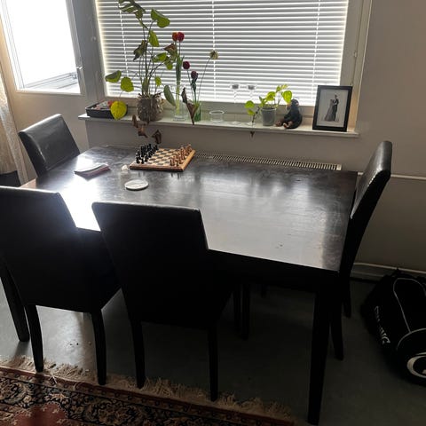Taittuva pieni pöytä ja pari jakkaraa. Ollut yksiön keittokomerossa. Käytännöllinen pieneen tilaan tai vaikka leikkimökkiin lapsille