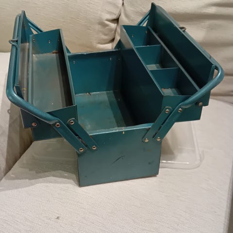 vanha peltinen/metallinen lääkelaatikko, työkalupakin mallinen. avautuu ja sulkeutuu niinkuin kuuluu, ajan patinaa löytyy mutta ihan asiansa ajava. toiminut työkalupakkina, voi käyttää myös esim kalastusvälineiden säilytykseen kun on kannet ja laatikot ja lokerot