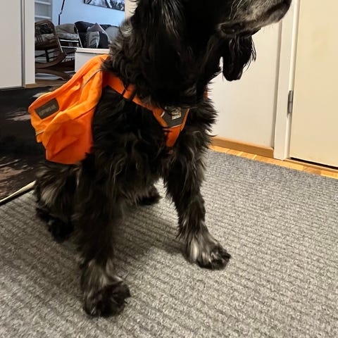 Tästä ei retkeilevän koiran varusteen hirveesti enää parane: Ruffwear palisade koiran reppu ja saman valmistajan webmaster Y-valjaat. M-kokoiselle koiralle. Rinnanympärys 69-81cm esim labbis, tai collie.