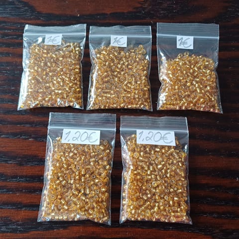 Siemenhelmiä. Koralekin. Rocailles. Kultaisia. 11/0 kokoisia. 8g. 1,20€. Haku tai postitus normi kirjeenä 2,95€ kirjekuoren kanssa tai helposti kuorella 3,75€.