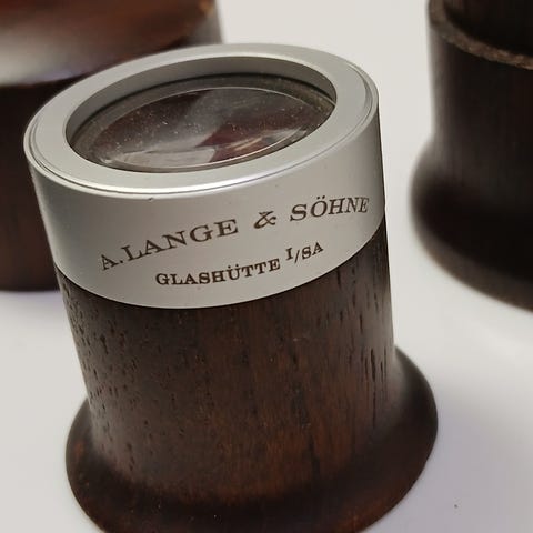 Sveitsiläinen Patek Philippe Geneve luuppi jalopuuta. Laadukkaan linssin kehys kullanväristä metallia. Luupissa Patek Philippe -sinetti.