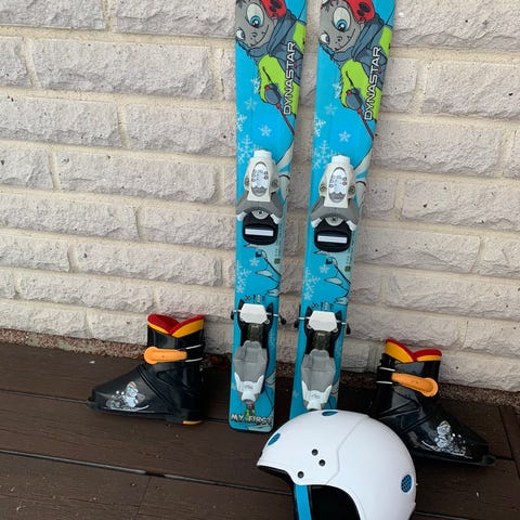 Head Race Team lasten 77cm pitkät laskettelusukset siteillä, laskettelukypärä ja laskettelumonot.
