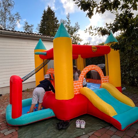 Pomppulinnaan mahtuu samanaikaisesti jopa 3 lasta (max. 40kg), ja se kestää 135kg painon.