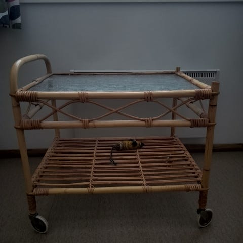 Metallinen kärry pyörillä, lehtiteline-osa tmv. sivussa.