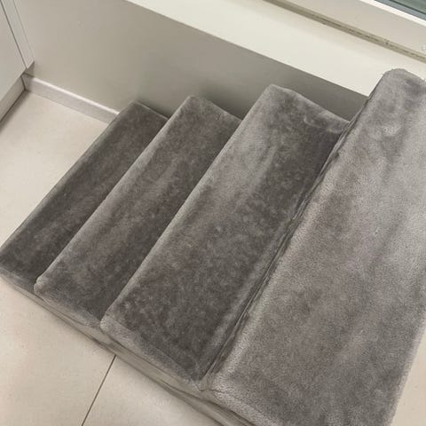 Pet Gear lemmikkiramppi / -portaat koirille tai kissoille. Kaksitasoinen rakenne helpottaa lemmikin pääsyä esimerkiksi sohvalle tai sängylle. Materiaalina kova muovi, värinä beige. Ylimmissä askelmissa on pehmeät, karheapintaiset matot, jotka parantavat pitoa. Pohjassa on rei’itetty rakenne keveyden ja tukevuuden vuoksi. Soveltuu sisäkäyttöön lemmikin kulun helpottamiseen ja nivelten rasituksen vähentämiseen. Koiralla ollu käytössä.