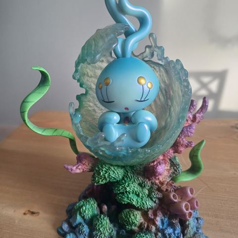 Pokemon Mew figuuri.Pienen kokoinen koriste- tai keräilyfiguuri, jossa vaaleanpunainen Mew-hahmo on kirkkaan pallon sisällä. Sopii esimerkiksi koristeeksi tai kokoelmaan. Materiaali vaikuttaa olevan muovi- tai hartsifiguuri läpinäkyvän pallon sisällä.
