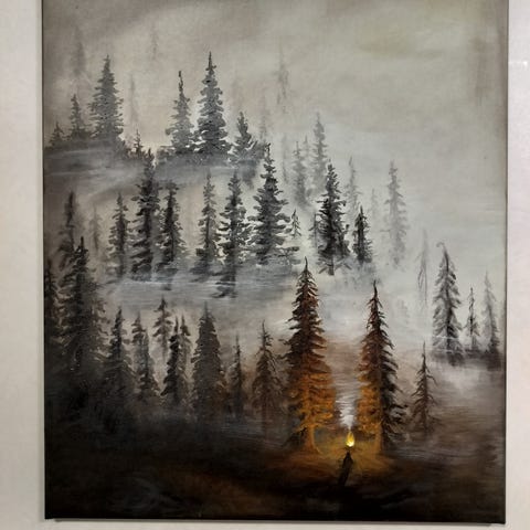 Suurehko kehystetty maisemamaalaus, jossa metsäinen kallio- ja mäkimaisema. Teoksessa näkyy etualalla kalliolohkareita ja käyriä mäntyjä, taustalla metsää ja taivasta. Ehjät kullanväriset kehykset. Tarjouksia otetaan vastaan!
