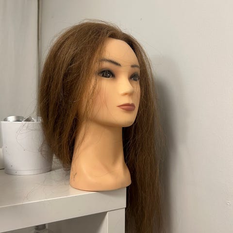 Harjoituspää ruskeilla pitkällä hiuksilla