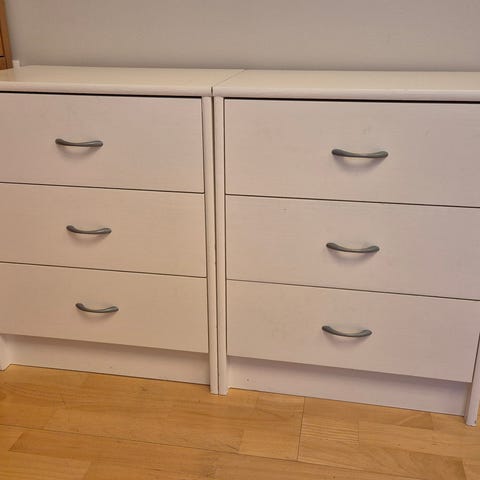Valkoinen lipasto. Kannessa muutama jälki ja yksi laatikon etukansi kaipaa liimausta, sillä irtoaa avattaessa.