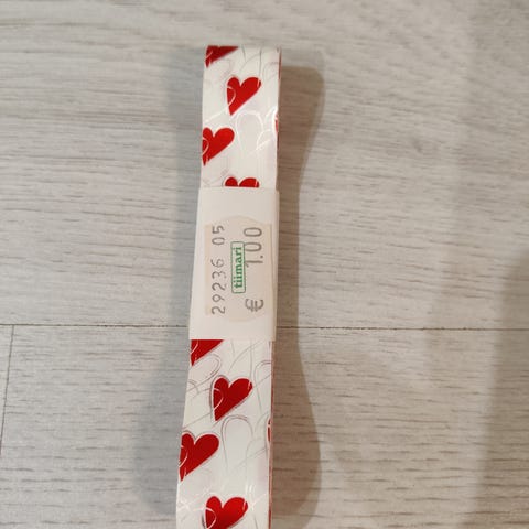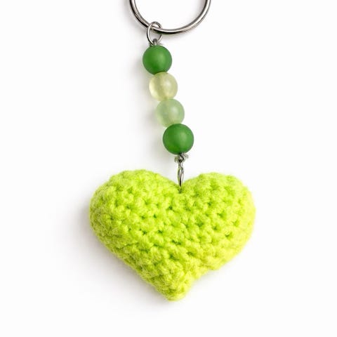 Punainen sydämen muotoinen avaimenperä. Pehmeä, neulottu tai virkattu sydänriipus on kiinnitetty metalliseen avainrenkaaseen. Avaimenperässä on sydämen yläpuolella useita punaisia helmiä koristeena. Tuote toimitetaan läpinäkyvässä pakkauksessa, jossa on taustakuvitus ja nauhakoristeita. Soveltuu esimerkiksi avaimiin, laukkuun tai reppuun kiinnitettäväksi koristeeksi.
