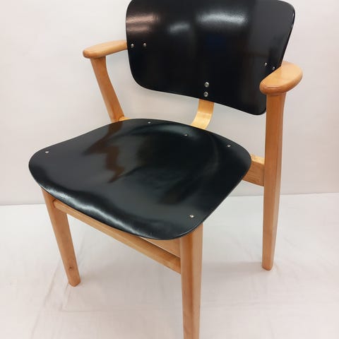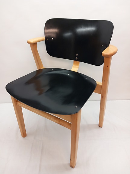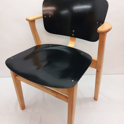 Kaksi Ilmari Tapiovaaran suunnittelemaa hyväkuntoista Artekin Domus-tuolia 1950-60 -luvuilta.